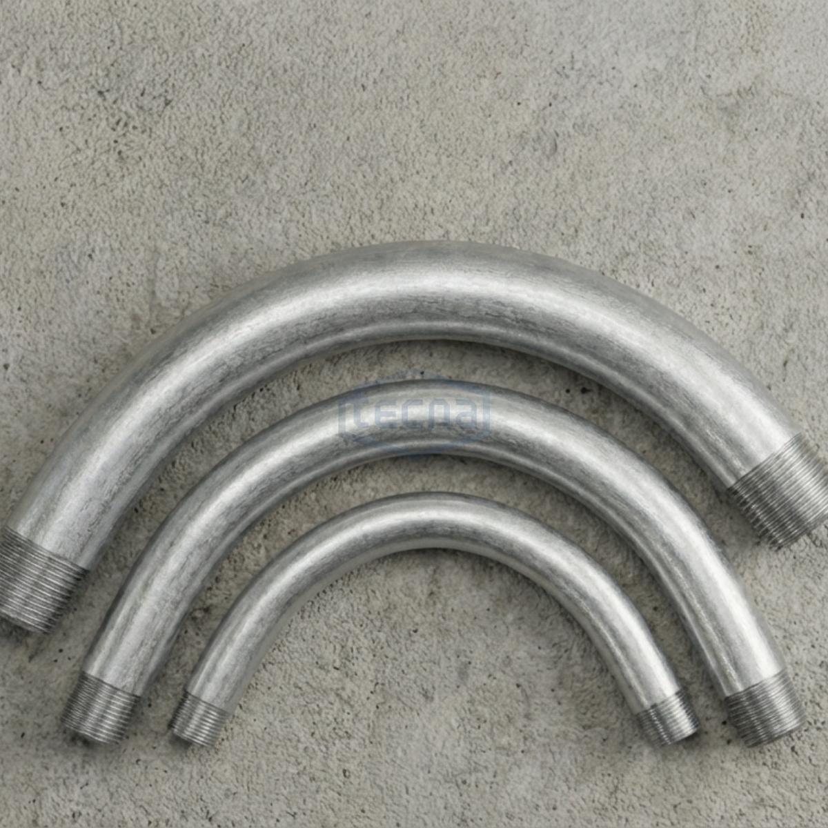 Codos de tubería TECNA en acero IMC galvanizado, diseñados para instalaciones conduit seguras y resistentes en múltiples aplicaciones industriales.